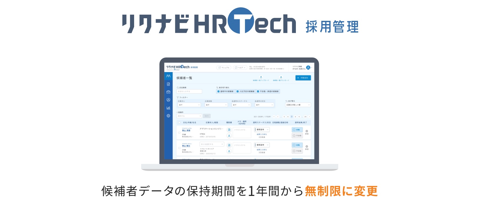 この度、リクナビHRTech 採用管理の候補者データの保持期間を、1年間から無制限に変更いたしました!